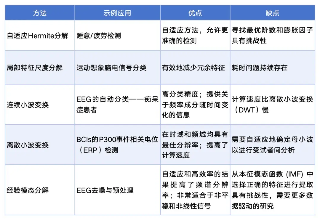 常见的脑电分解域技术包括自适应Hermite分解、局部特征尺度分解、小波变换(又包括连续小波变换(CWT)和离散小波变换(DWT))、经验模态分解(EMD)。
