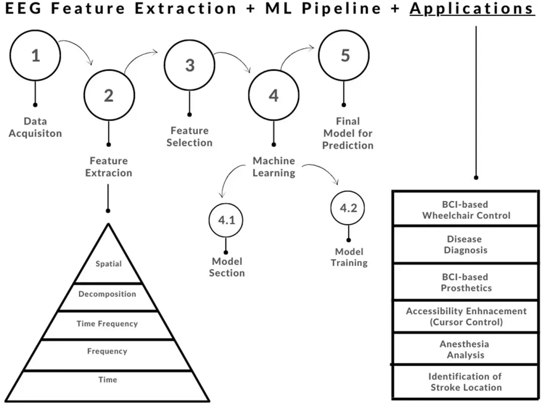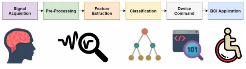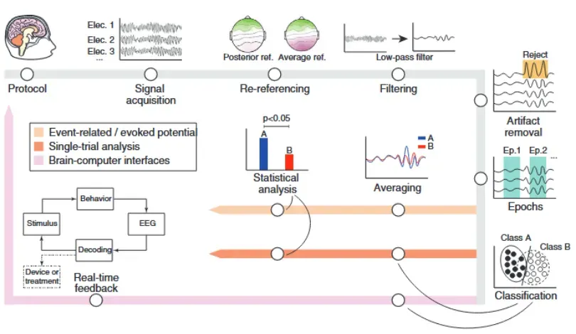 在此,我们展示了三个“流程”,描绘了部分脑电图(EEG)处理和分析步骤。图中的灰色部分为所有分析所共用,通常被称为“预处理”。在此阶段,信号被获取,每个通道的记录都参照共享电压。然后,在频域对信号进行滤波,以排除潜在的非生物噪声。检查信号是否存在例如由肌肉活动引起的伪迹,并提取相关数据段以供后续处理。此时,不同事件相关电位(ERP)的数据段被分组并平均,从而获得一组时间序列,通过统计学方法进行比较以评估显著差异。单次试验分析则对数据段的处理方式不同:不是进行平均,而是根据条件对数据段进行分组后,训练一个分类器——本质上是一种能够从信号自身的一组特征中辨别出产生信号的条件的算法——并提供分类器性能的统计度量。脑机接口采用与单次试验分析相同的分类方案,但不是量化分类器的性能,而是实时向用户提供机器当前决策的反馈。