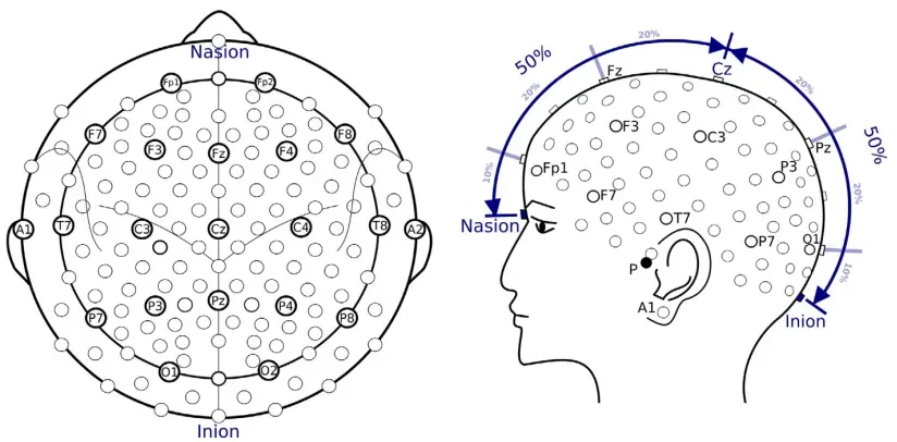 脑电图记录电极标准化位置的基本原则是左右对称,距离等比例,覆盖大脑半球凸面的主要解剖部位,建立普遍一致并可重复对比的电极位置系统。Jasper(1958)最初提出的10-20系统是国际上公认的描述EEG头皮电极位置的方法之一,它保证了电极间距离相等。在这里,电极被放置在四个解剖标志的10%和20%的位置:鼻、耳、左、右耳前点。