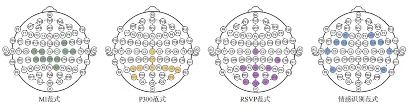 根据外部刺激来源信号,主要包括ERP(基于视觉、听觉、触觉、嗅觉等的P300、SCP、反射性语义调节等)和SSVEP范式等。此外,越来越多的研究使用两种或多种生理测量的多模态范式进行研究, 如P300+SSVEP、MI+SSVE。