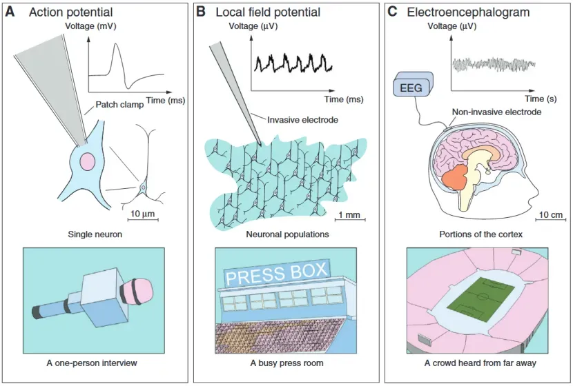 如果你处于演播台报道这场足球赛,你无法记录教练球员间的对话,但是你可以捕捉到演播台其它人员声音以及外面观众的声音。这类似于记录局部场电位Local Field Potential,LFP,其中有近端和相对远端事件的贡献,代表电极的局部区域神经元电信号的总和。