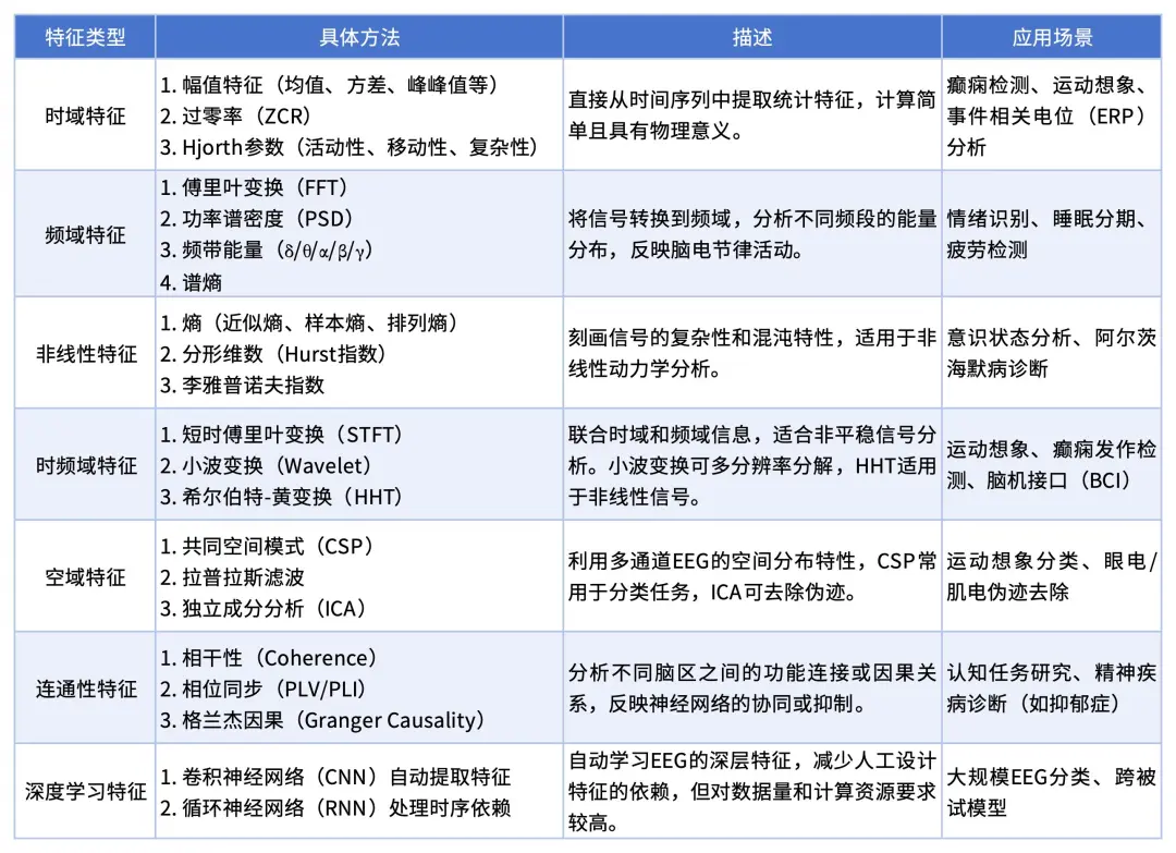EEG信号数据是通道数与时间的二维数组,我们从时域、频域、分解域、时频域和空间域特征等方面介绍单维和多维脑电信号处理和特征提取技术,主要为时域特征,频域特征,时频域特征和空域特征等。